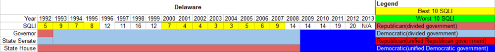 The chart below depicts the partisanship of the Delaware state government and the state's SQLI ranking for the years studied. For the SQLI, the states were ranked from 1-50, with 1 being the best and 50 the worst. For twelve out of the twenty years observed during the study, Delaware ranked in the top-10 of the SQLI ranking. The state dropped out of the top-10 for a period between 1996 and 1999, hitting the rank of 16th before climbing back into the top-10 for eight more years. It again dropped out of the top-10 in 2008 and has remained out of the top rankings since then. Delaware has never had a Republican trifecta, but has had a Democratic trifecta since 2009. In the state’s longest period of divided government, there was a Democratic governor, a Democratic state senate and a Republican state house. Delaware achieved its highest SQLI ranking (3rd) in 2003 and 2004 under divided government, and its lowest ranking (20th) in 2012 under a Democratic trifecta.