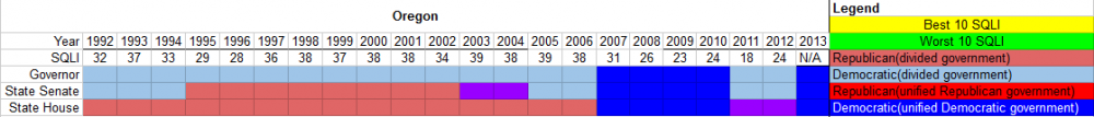 The chart below depicts the partisanship of the Oregon state government and the state's SQLI ranking for the years studied. For the SQLI, the states were ranked from 1-50, with 1 being the best and 50 the worst. Oregon had Democratic trifectas from 2007-2010 and again in 2013. The state's lowest SQLI ranking, finishing 39th, occurred in 2005. Its highest ranking, finishing 18th, occurred in 2011. Both occurred when the government was divided.