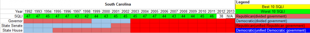 The chart below depicts the partisanship of the South Carolina state government and the state's SQLI ranking for the years studied. For the SQLI, the states were ranked from 1-50, with 1 being the best and 50 the worst. South Carolina ranked in the bottom-10 during every year of the study except the most recent. In 2012 it improved, finishing at 38th. The state's worst ranking, finishing 47th, occurred during both divided government and Republican trifectas.