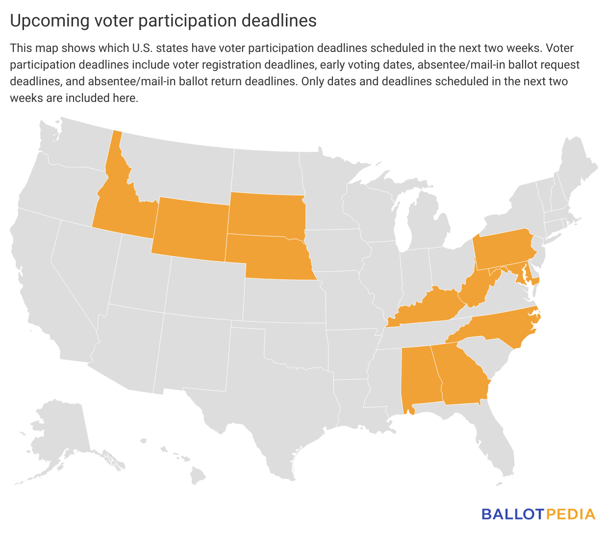 The map below shows the states that have voter participation deadlines scheduled in the next two weeks. The bulleted list below includes every state with deadlines between April 10 and April 23.