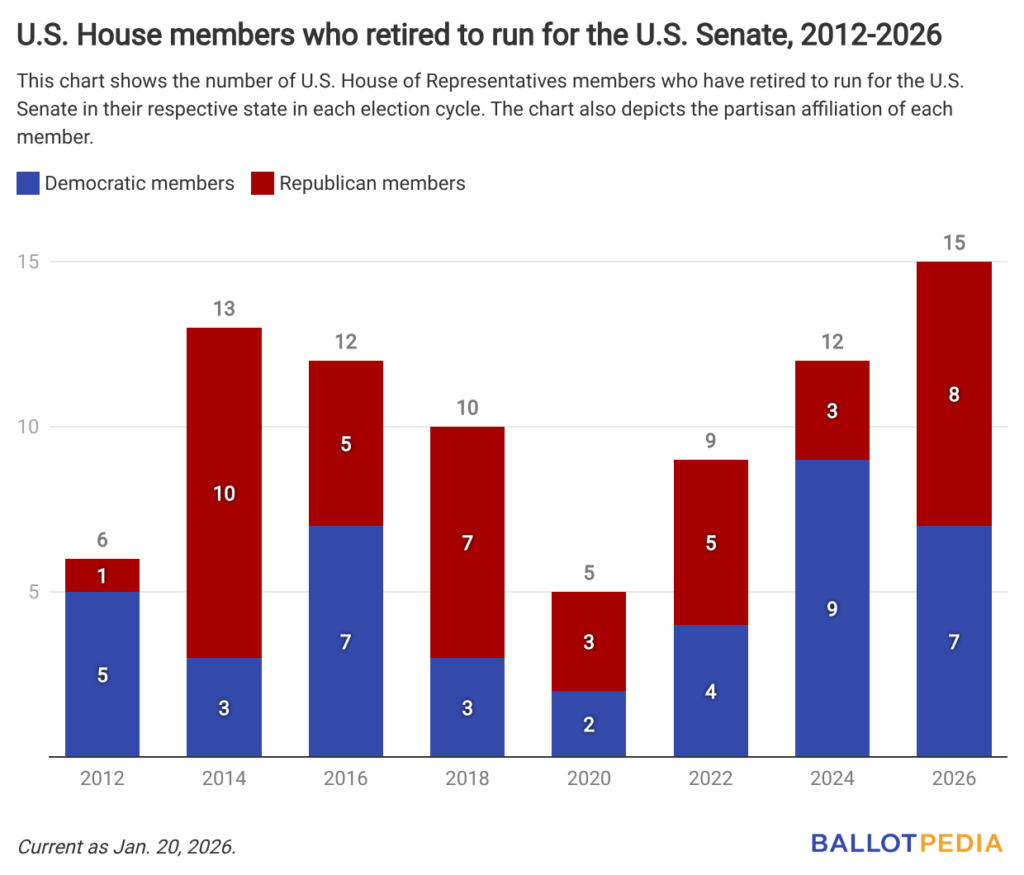 - Fifteen members of the U.S. House are running for the U.S. Senate in 2026