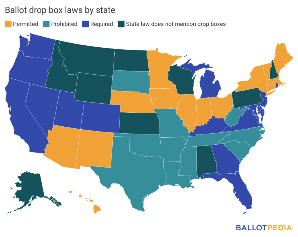 States have varying policies on drop boxes. Fifteen states require drop boxes, 14 permit drop boxes but do not require them, 11 prohibit drop boxes, and 10 do not mention drop boxes in their statutes.