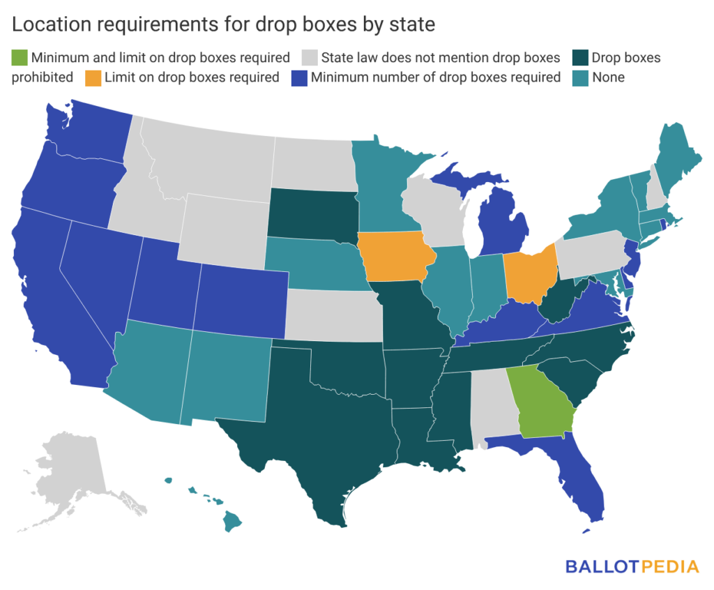 Drop boxes can be located inside or near different places, such as government buildings, polling places, and early voting sites. Thirteen states require local governments to establish a minimum number of drop boxes, while two states place limits on the total number of drop boxes. One state, Georgia, has both a minimum number of drop boxes and a limit. Thirteen states allow or require drop boxes, but have no restrictions on their number.