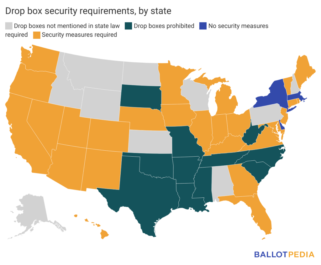 Some states require drop boxes to have certain security features. These requirements can include video or human monitoring, bolting drop boxes to the ground, or drop boxes designed to suppress fires. Twenty-six states require security measures for ballot drop boxes, while three states have none.