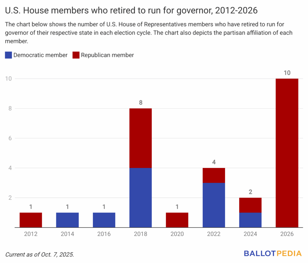 The 10 U.S. House members retiring to run for governor in 2026 is the most to do so since we started following this data in 2012.