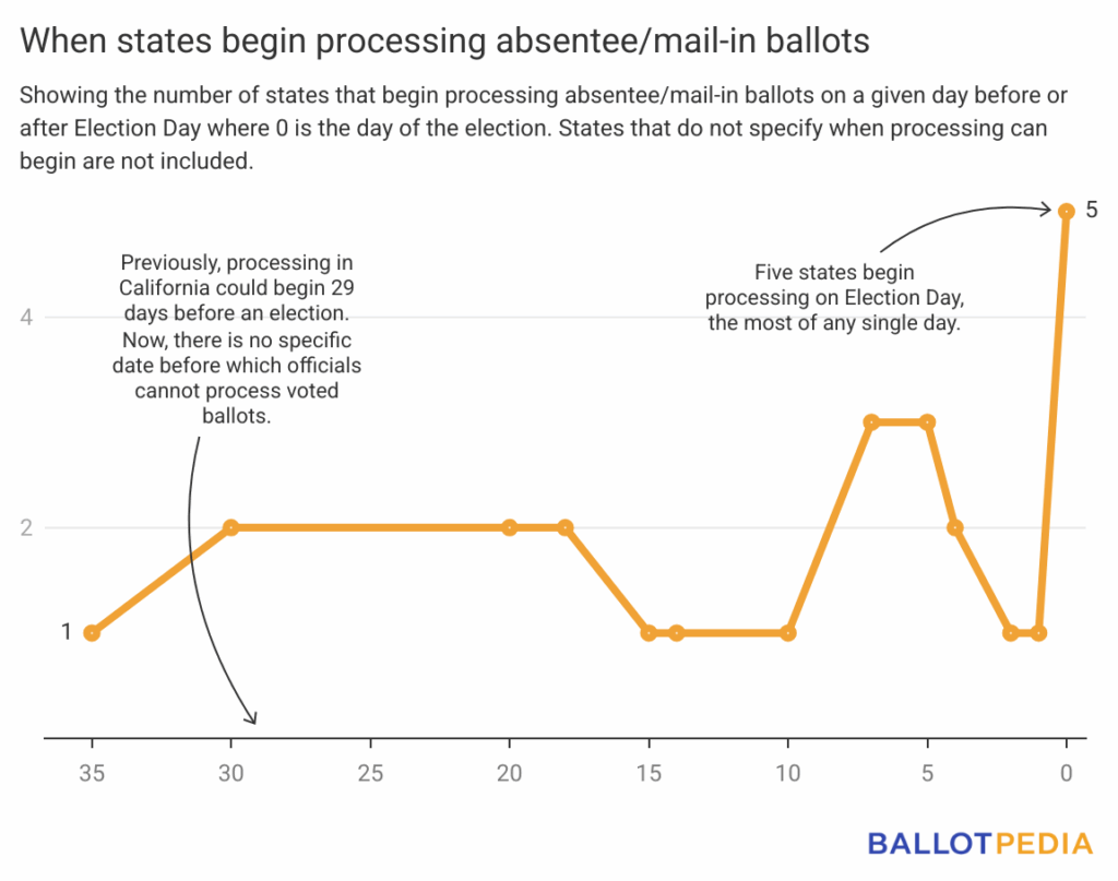 - In five states, election officials do not begin processing any aspect of absentee/mail-in ballots until Election Day.