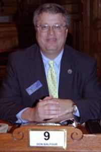 Don Balfour (b. May 3, 1957) is a former Republican member of the Georgia State Senate, representing District 9 from 1993 to 2015. Balfour was suspended from his duties as Senator from November 2013 to January 2014. This stemmed from his September 2013 indictment on felony charges of making a false certificate, theft by taking and false statement and writing.[1][2] Balfour was acquitted of all charges in December 2013 and reinstated as Senator when the chamber convened its 2014 session.[3][4]