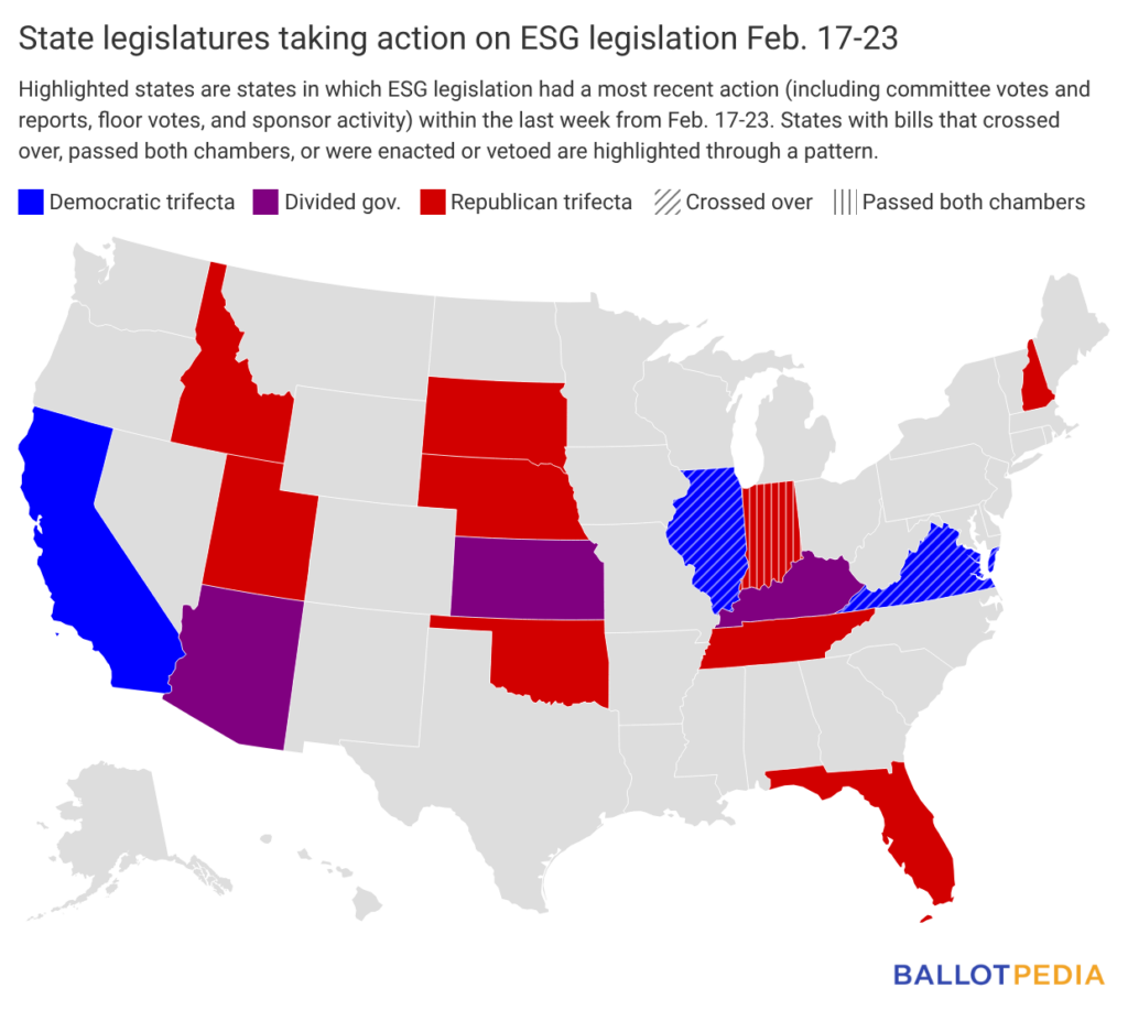 Fifteen states took action on 20 ESG-related bills last week (since Feb. 17).