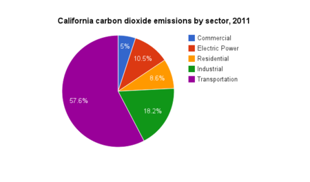 In 2011, California's carbon emissions ranked second highest in the United States. Carbon emissions in California decreased from 360 million metric tons in 1990 to 346 million metric tons in 2011. Emissions peaked in California at 396 million metric tons in 2007. In 2011, the transportation sector accounted for 57.6 percent of all CO2 emissions in California.[30]