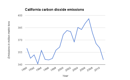 ![]() Carbon dioxide emissions in California (in million metric tons). Data was compiled by the U.S. Energy Information Administration. |