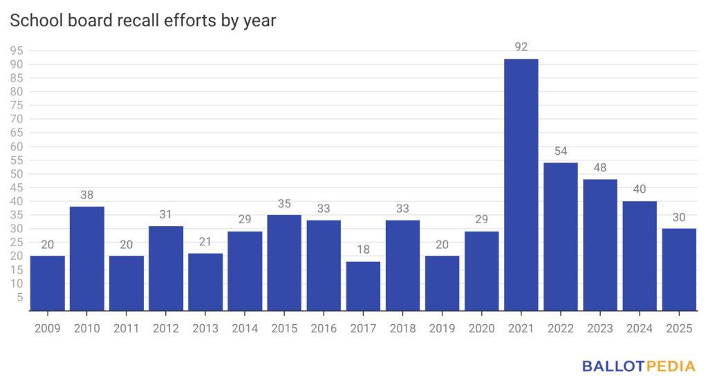 Ballotpedia recently released our annual report on recall campaigns in which we covered 30 recall efforts against 57 school board officials in 2025. School board recall efforts reached a record high in 2021, when campaigns targeted 237 officials in 92 efforts. That year, school board members were the most targeted for recalls across all office types.