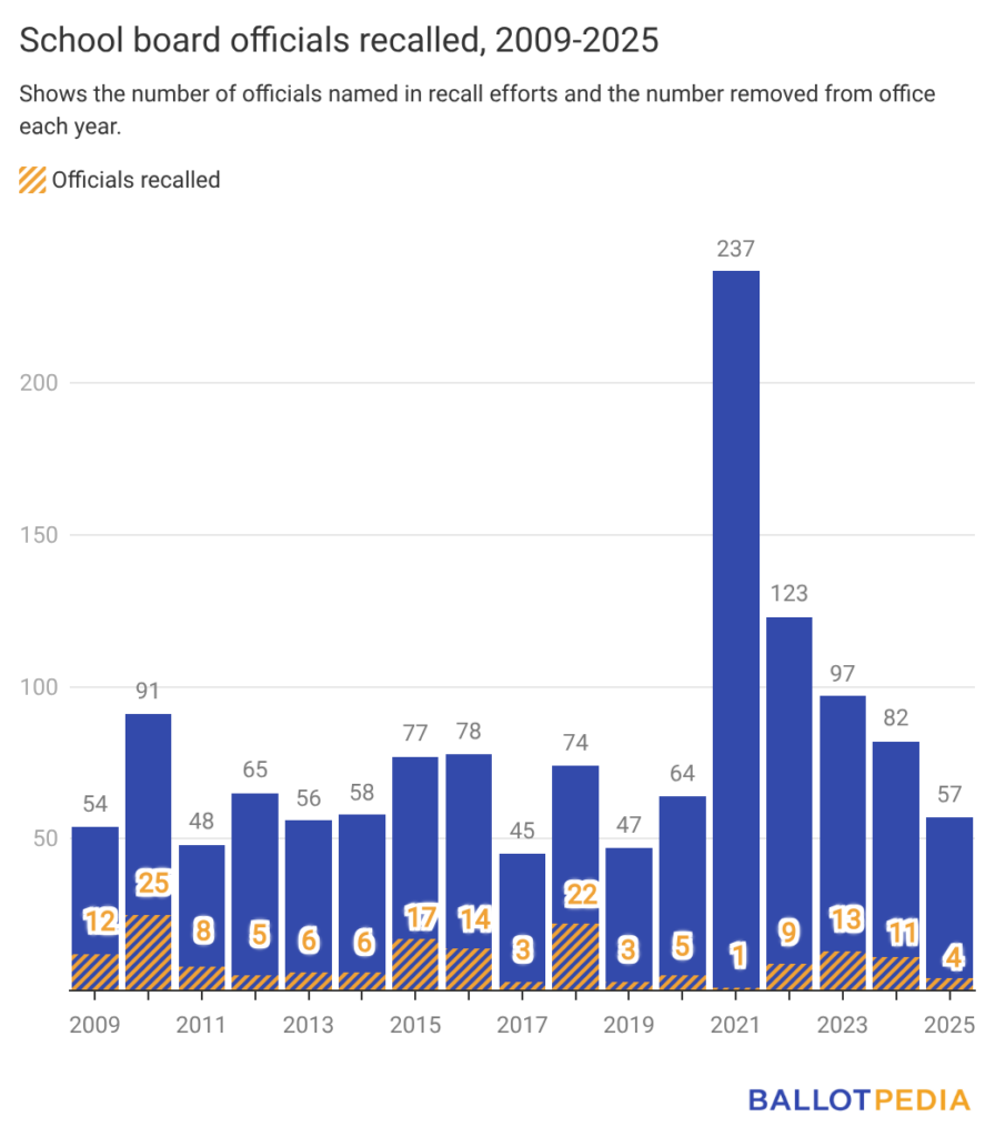 In 2025, voters removed four of the 57 targeted officials — a 7% success rate. That’s the lowest since 2021, when voters removed 0.4% (one of 237) of officials named in petitions. In both 2024 and 2023, voters removed 13.4% of targeted school board members.
