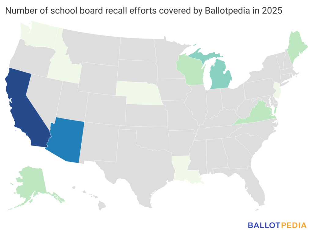 Recall efforts against school board members took place in 12 states in 2025. California and Arizona had the most recall campaigns, with eight and six, respectively. In 2024, California and Michigan saw the most efforts aimed at school board members, with 12 and nine, respectively.