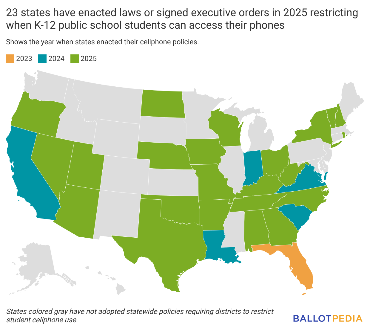 - Twenty-three states have restricted student cellphone use in K-12 public schools this year