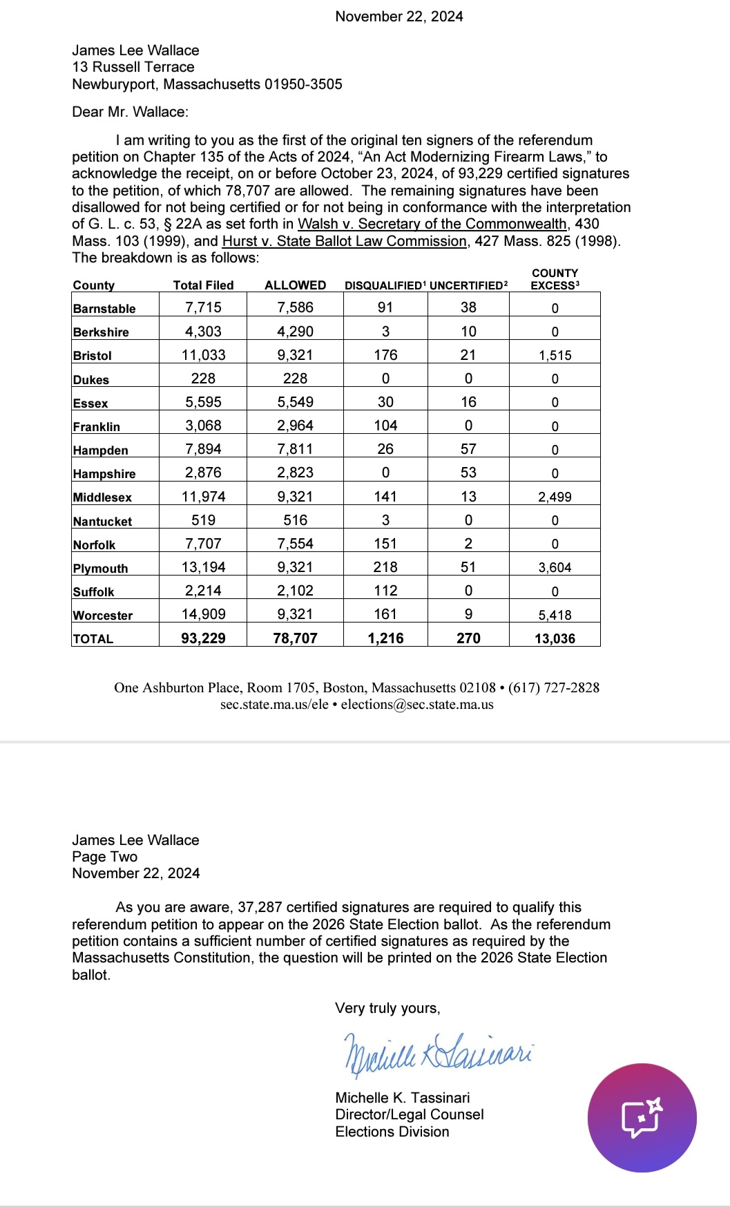 - ↑ 2.0 2.1 Massachusetts Secretary of the Commonwealth, "Signature Verification Notice," November 22, 2024
