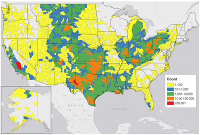 The map above shows oil and natural gas well counts across the United States. According to the U.S. Department of Energy (DOE), there are more than 4 million oil and natural gas sites that have been drilled in the United States over the last 150 years. At least half of these wells have been treated using fracking. The DOE further estimates that more than 95 percent of all current oil and gas wells are being fracked. Fracking accounts for more than 43 percent of oil and 67 percent of natural gas production in the United States.[7]