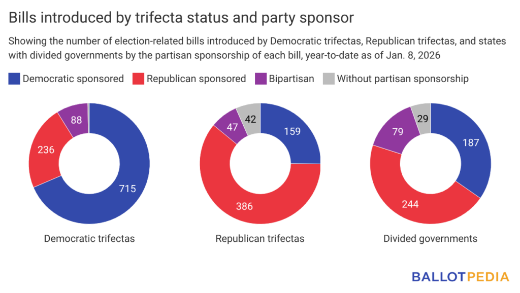 See the charts below for a comparison of total bills between 2024 and 2026 and a breakdown of all 2026 legislation by trifecta status and partisan sponsorship.