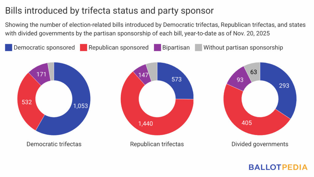 See the charts below for a comparison of total bills between 2023 and 2025 and a breakdown of all 2025 legislation by trifecta status and partisan sponsorship.