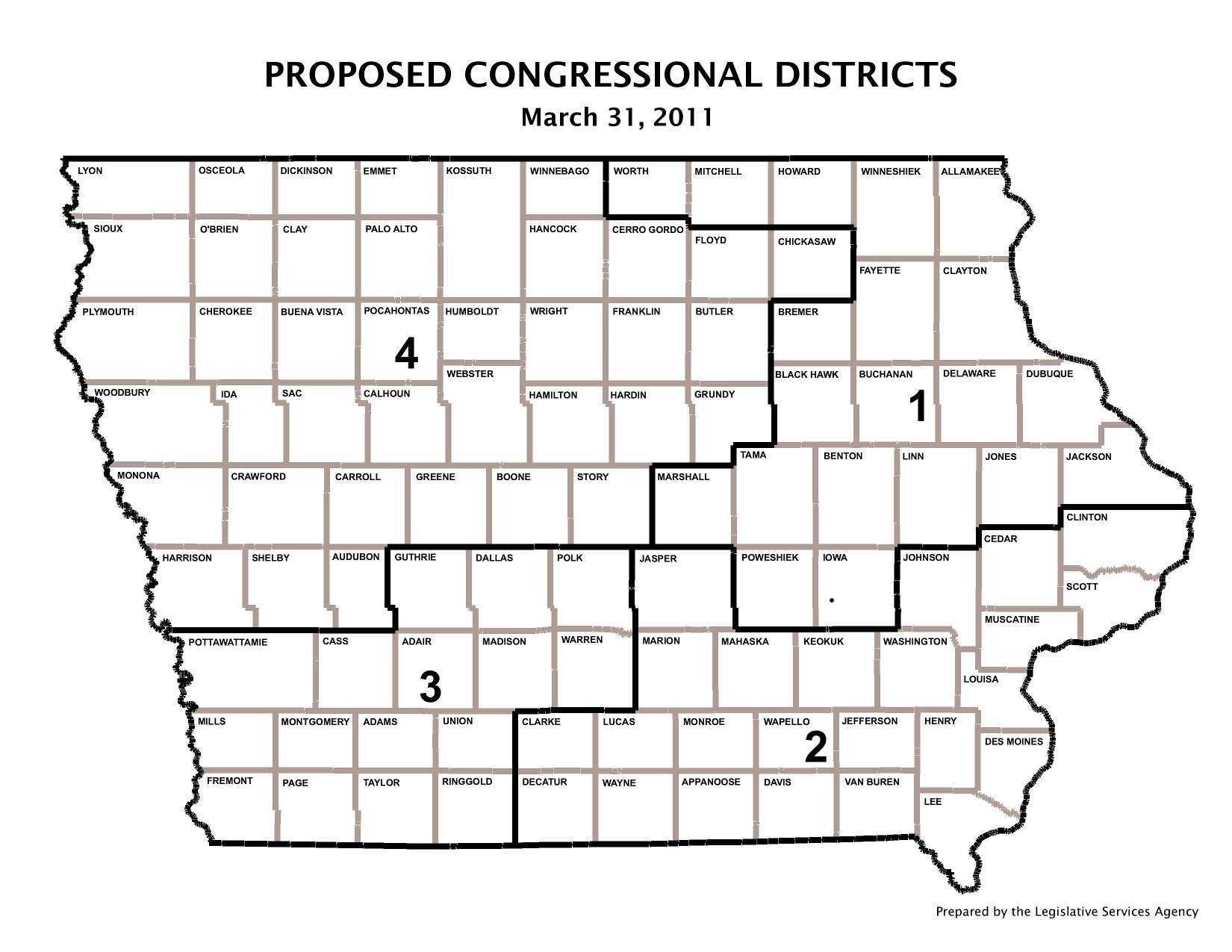 This image comes from the http://www.legis.iowa.gov/DOCS/Resources/Redist/2011/2011-03-31/Plan1_SmallMap_Congress.pdf. It is used here because a Ballotpedia staffer requested and obtained permission to use it and was informed by the relevant government office or private entity or individual who created this image that the image is in the public domain. For details on the permission received, see image permissions.